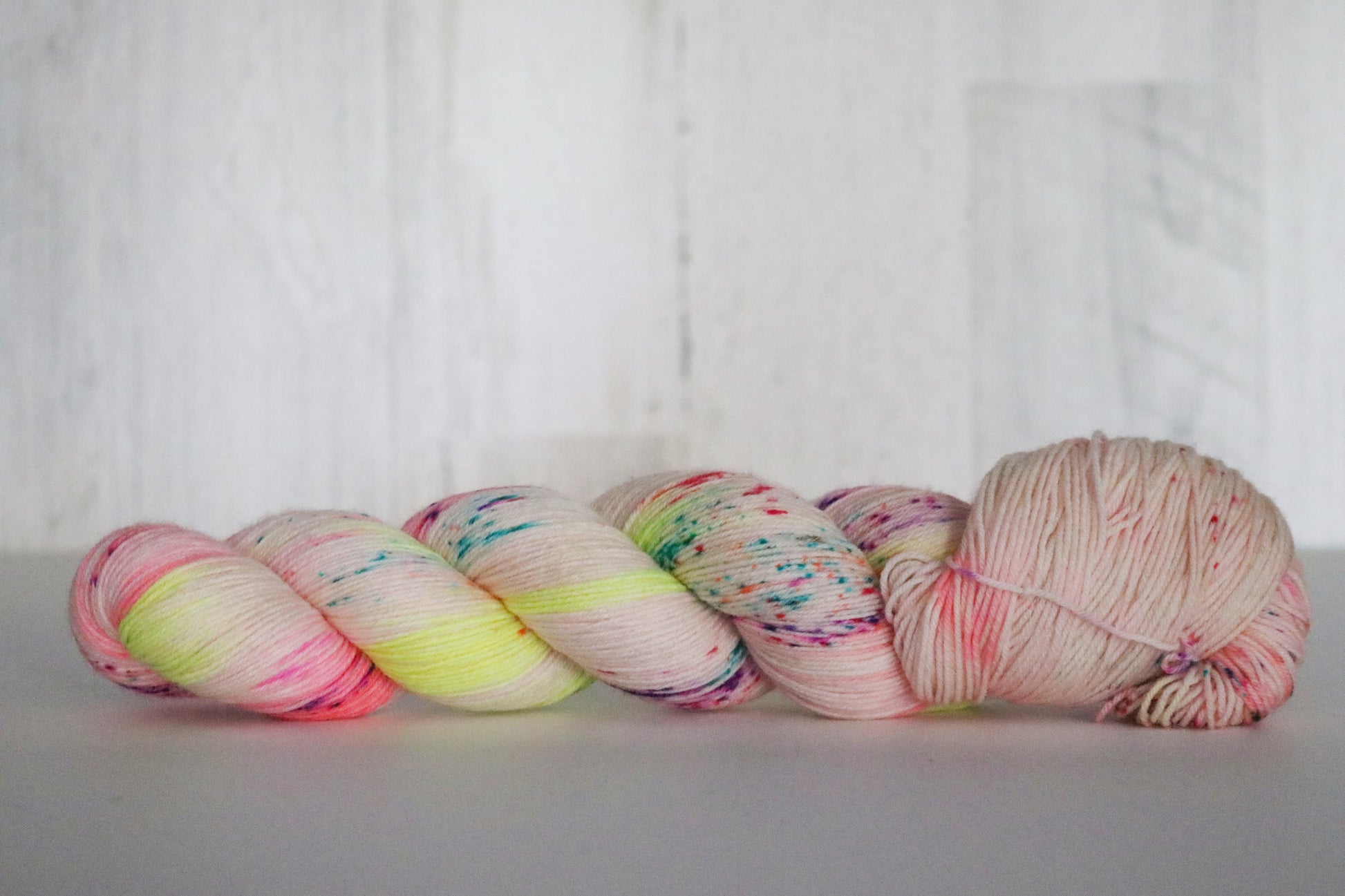 Neon yellow and neon peach topped with neon rainbow speckles.