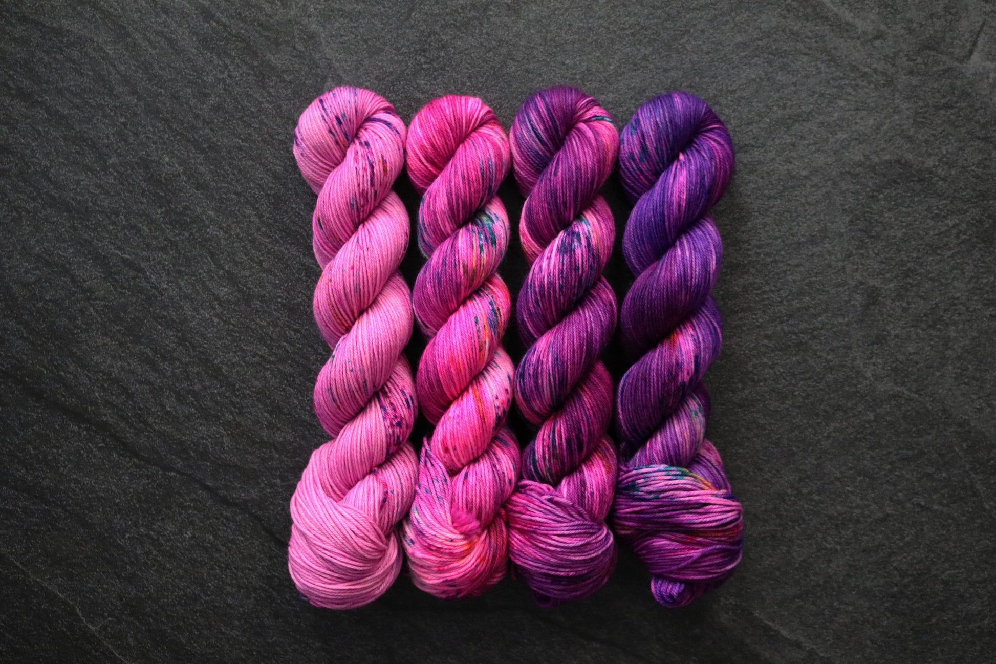 All yarn is dyed with professional grade acid dyes. Since this is a hand dyed yarn, no two skeins are alike (yep, they're all unique!) but all efforts are made to keep all skeins as consistent as possible.