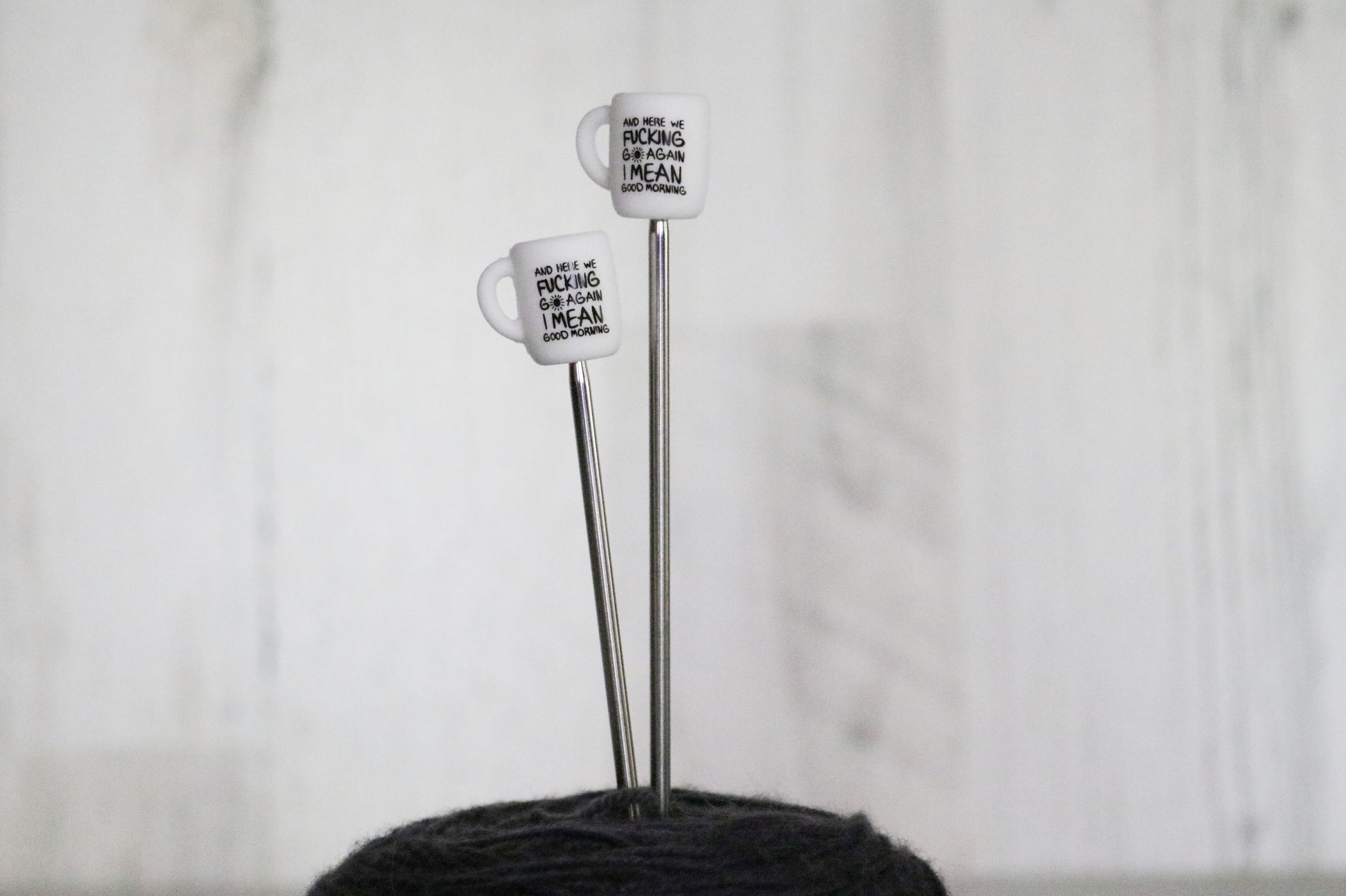 This snarky stopper will keep your needles cozy when you're not working on your project. These measure approximately 1" and fit needles US 2 (2.75mm) and up.
