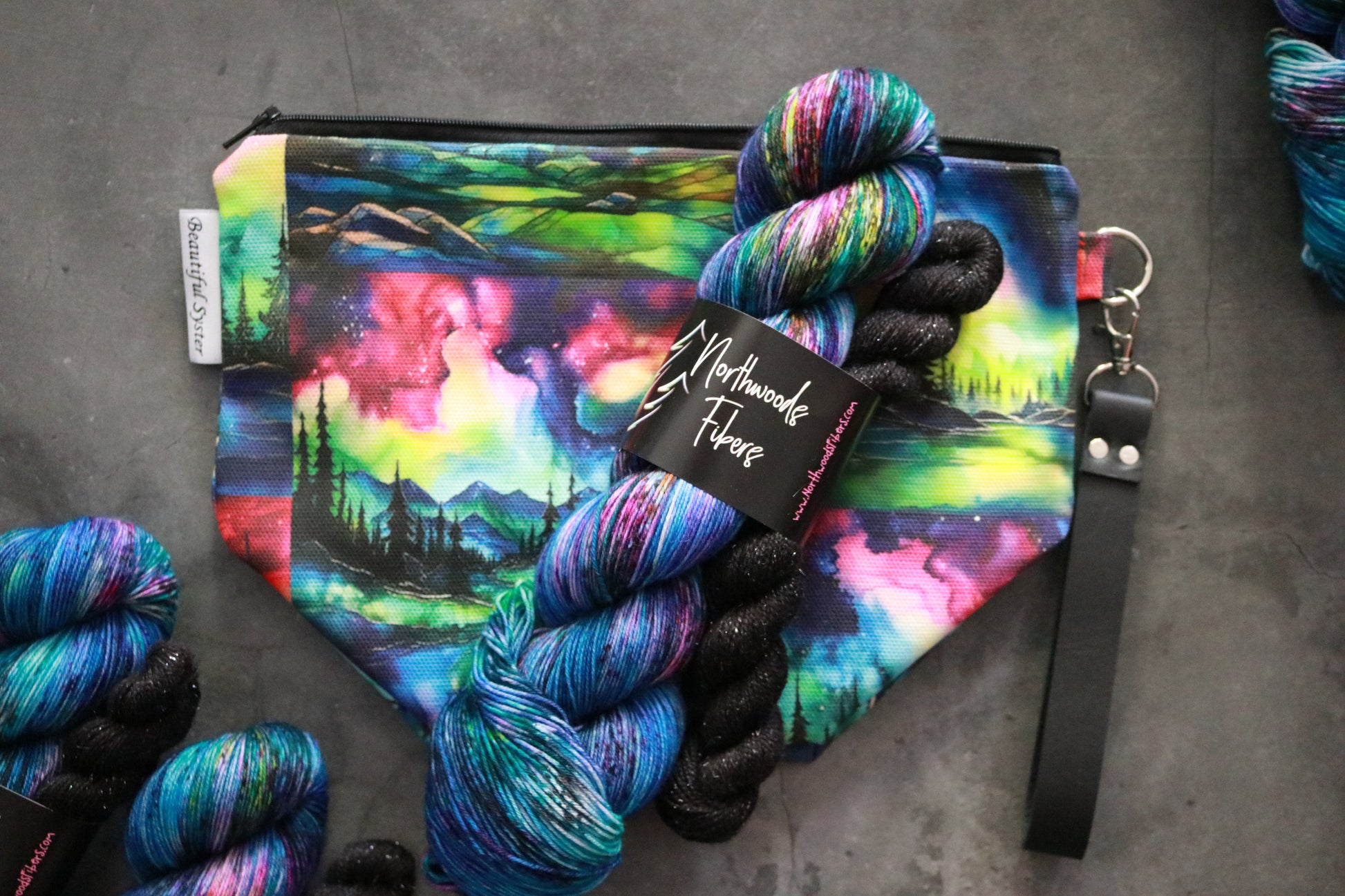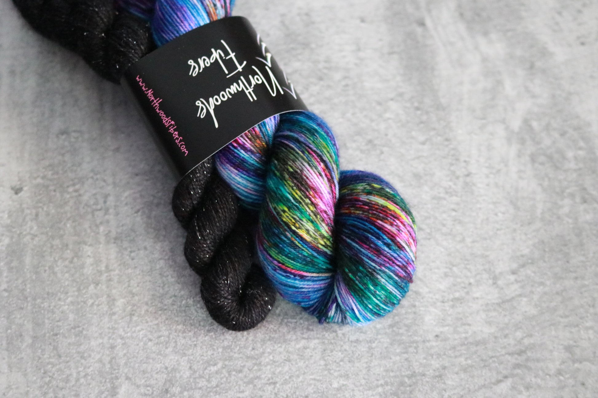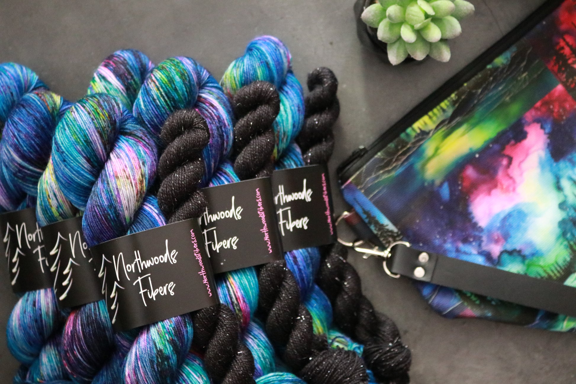 Let's talk yarn! These sock sets are perfectly paired with this project bag. Hues of deep, dark blue mix with more vibrant blues and are topped with bold speckles to mimic the northern lights. Topped with yet another layer of black speckles, this set is moody, yet still bright. Paired with a Spruce Sparkle Mini in Onyx.