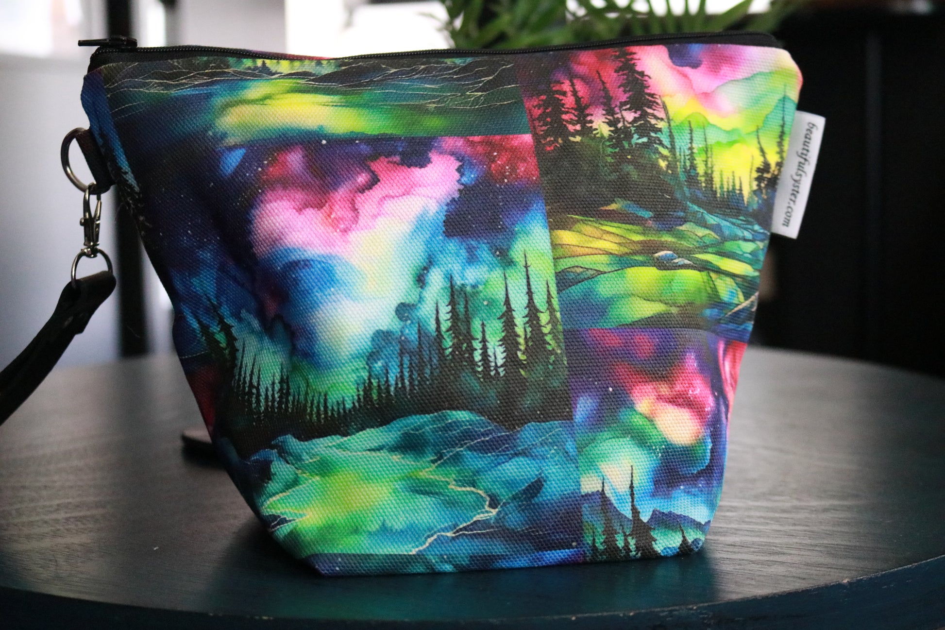 The Ismira bag from Beautiful Syster features the beautiful northern lights, colorful mountains and of course, those signature Northwoods trees. Made out of a stiff canvas fabric, this bag holds its shape and can fit 2 skeins, notions pouch, pattern, and anything else you may need for your project! A zippered top ensures all your goodies stay in place, and did I mention there's an interior pocket?! The bag is approximately 7-3/4" H x 11" L x 6-1/4" D.